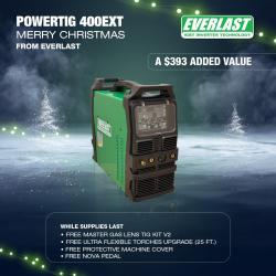 If you need the most power the PowerTIG 400EXT is the latest and most powerful member of Everlast's PowerTIG series of TIG/Stick welders. With 35% duty cycle at 400, there's enough power to weld most every TIG welding chore found in most any shop and do it without stopping every minute or so to rest. Compared to other competitors in it's class it's also more duty cycle in single phase than any other welder as well with a 35% duty cycle at the full 400A in TIG mode. The welder also has a generous 315A output @ 35% duty cycle in stick mode which means it has enough stick power to tackle almost any common stick fabrication or repair chore with up to 1/4" electrode. For AC TIG applications, the Advanced AC pulse feature this unit is capable of delivering considerably more TIG welding capability (thickness) than any other unit in it's class. This unit is designed to get the job done where thicker plate and weldments are common. As far as features go, the PowerTIG 400EXT doesn't fall short either. It has all the familiar features you've come to expect in the EXT digital class of welders from Everlast. as far as basic layout and operation are concerned for those shops that want to upgrade to a heavier unit without retraining personnel. Duty cycle is a favorable 35% at maximum output and is able to go the distance with its high output constant-on fan design. As far as low end performance goes, this brute is far from clumsy. It features a respectable 5A DC and 10A AC low end operation capability. Just add a power plug, gas and Tungsten, and you are ready to weld.