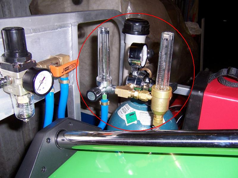 for example, if you want 2 litres per hr for the purge and 5 for the torch then leave the valve to the torch wide open (always) and set the regulator so that it goes to 7 when you step on the pedal briefly. After the torch postflow stops and the flow gauge has dropped back to zero, open the purge valve until you get 2 on the flow gauge. When welding starts this will jump up to a regulated 7, 5 for the torch and 2 for the purge.