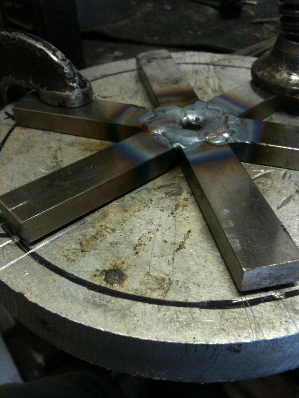 these are images of a single wheel design currently in progress. I choose to use 1/4" x x1/2" crst stock to begin fabrication of the bulk of the spokes, & plastic pipe section for the center wheel well. Eventually when the original is complete I'll make a mold to reproduce in different mediums like plastic, aluminum, bronze, etc.