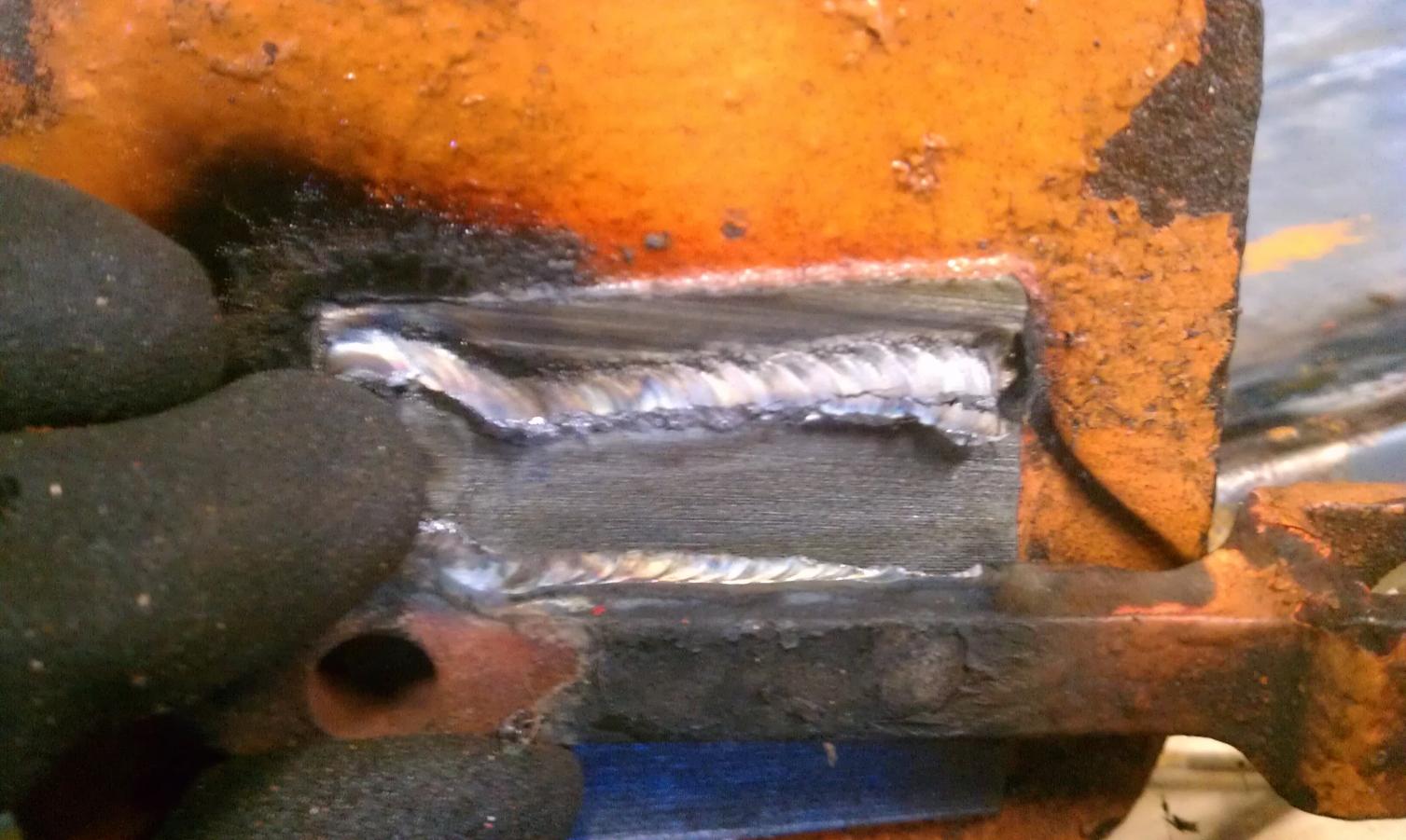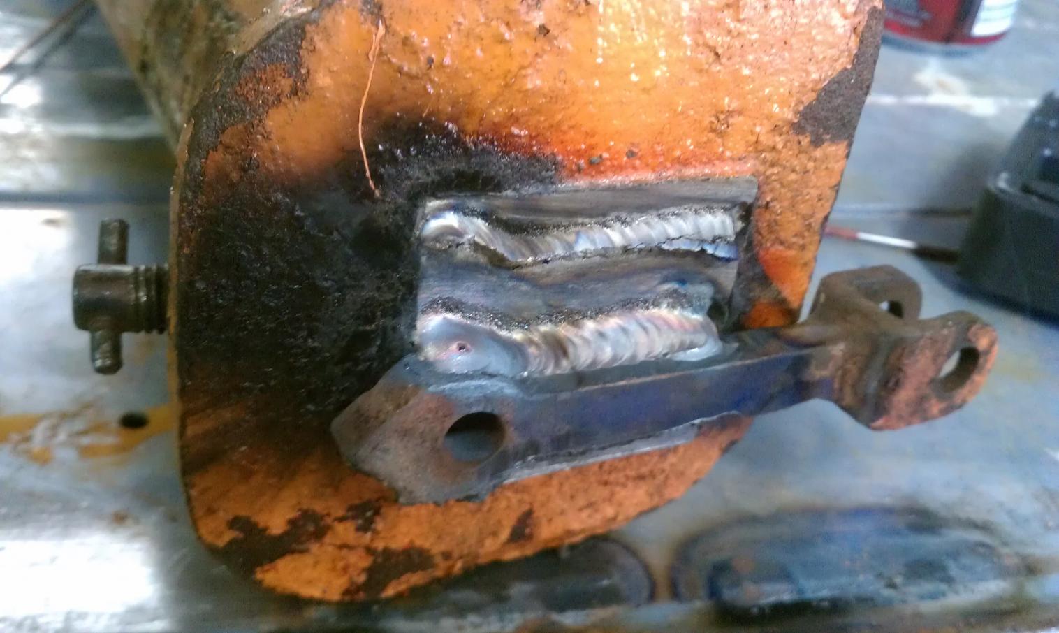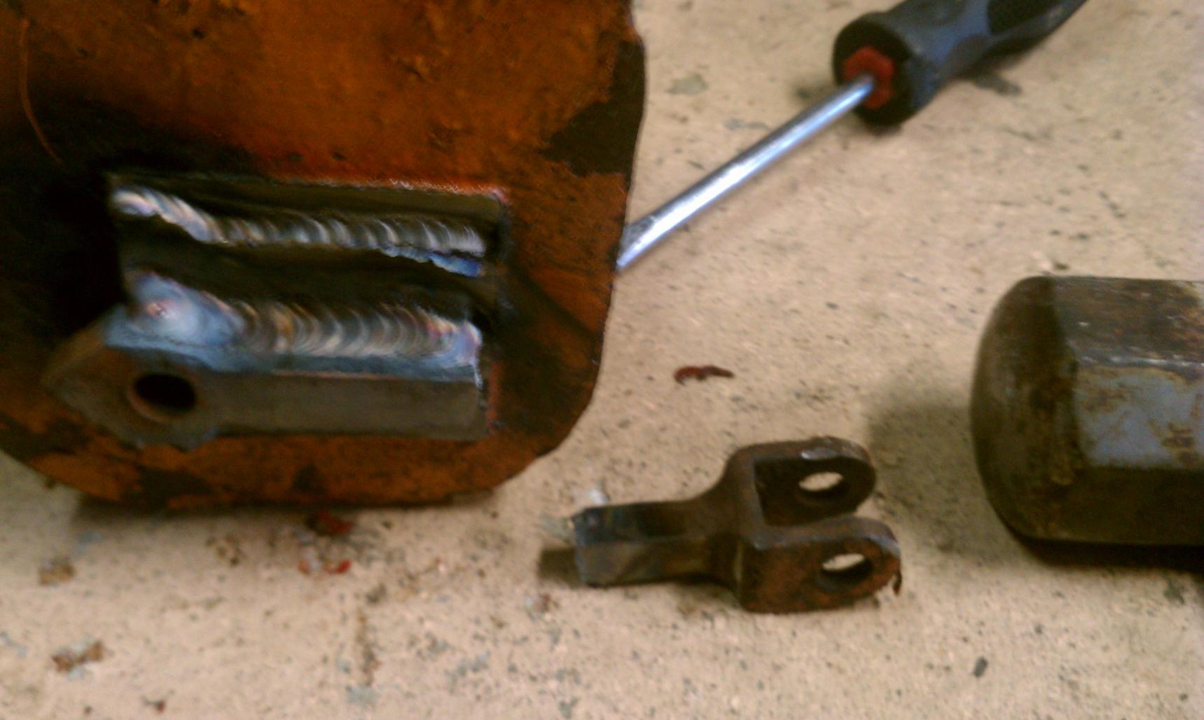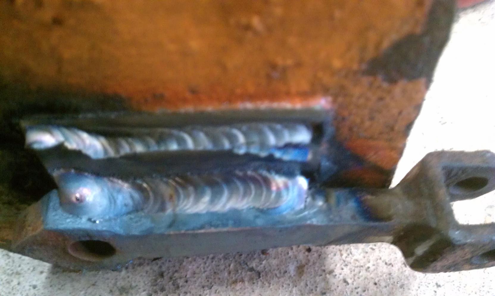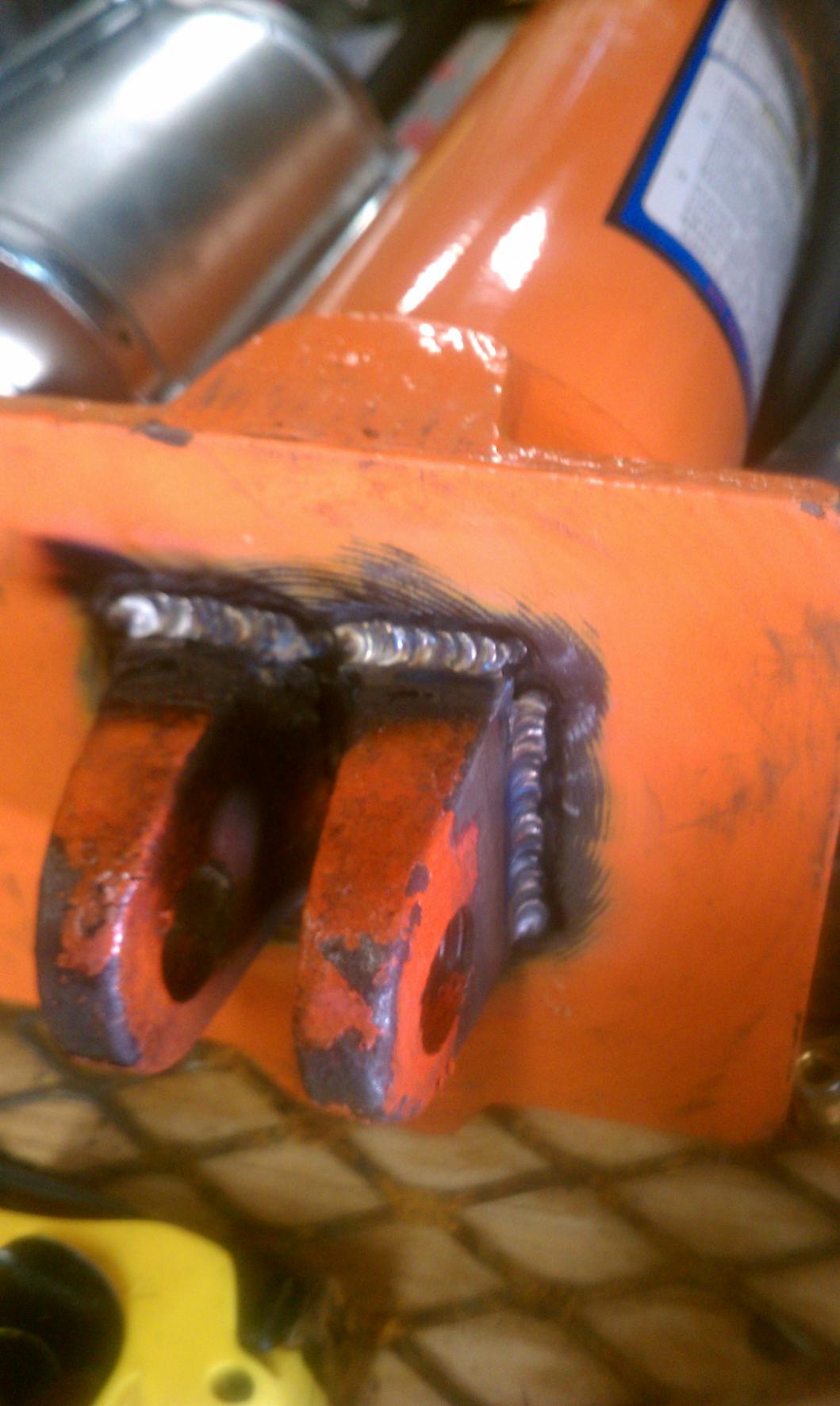 The only differences between these two, at least that matter to me, is the flat bottom one is not a direct bolt in for my HF engine hoist. So I decided to use my HF bandsaw, cut off the old flange and weld it onto the new jack. Keep in mind I was not terribly worried about perfect penetration since this part will remain in compression under a load.