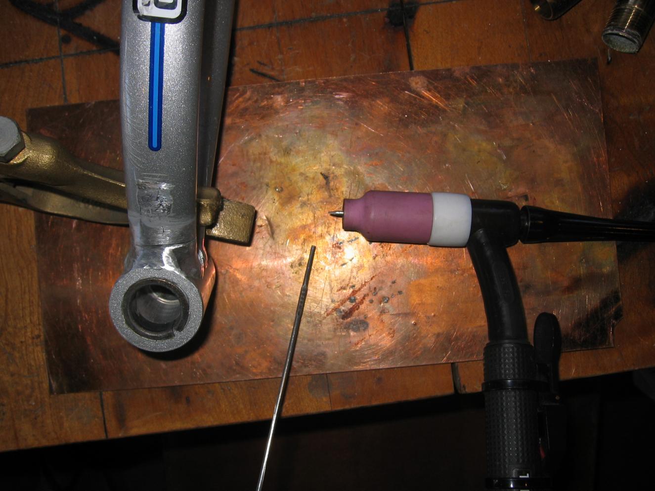 Note: 1/16" 5356 filler rod ready to go. Also, sometimes with painted parts, there aren't a lot of places you can ground to, and you do what you can.