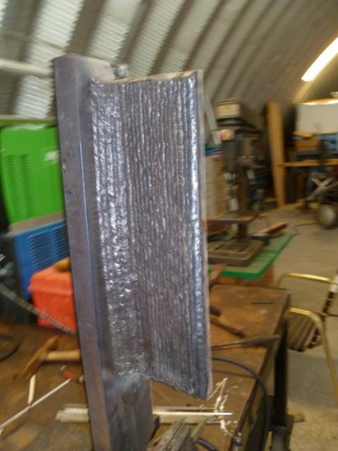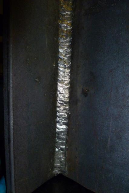 So, last night, I played with my plasma cutter, I had absolutely no idea that there was a leaerning curve to using a plasma cutter, but there is. Finally, it was time to bust out the welder. Problemo numero uno, the steel that I'm using for this project is deeply pitted, and rusty. Knowing that, I expected to use the stick function on my 250EX. I go to grab my stick welding gloves, no dice. I'm unable to locate the box that I have that contains a dozen or so pairs of mig, tig and stick welding gloves. Problemo numero dos, I THOUGHT I had some 7018 rod in 1/8", wrong! All I have is 3/32". So that leaves me welding 3/8" plate to 5/16" plate with a max of 100 amps. Oh well. I set the machine up in DCEP, 100 amps, and arc force in the middle of the scale. I haven't ever used arc force so I have no idea what to expect. I tack the piece in place, clean the tacks, then go to town. I will say this. The arc is so smooth that I didn't want to stop, so I actually welded over each bead with a second pass, just to feel it again! On the second pass, I turned the arc force to minimum on one side, and max on the other. I noticed that with the arc force turned up, the arc feels and looks "deeper" into the puddle, but the results looked close. I think it will take a good bit more experimentation to fully understand this function. Keep in mind that these are passes OVER the initial pass, and they're the FIRST welds I've made with the 250EX in stick mode, but comment, because any help on improving will be greatly appreciated.