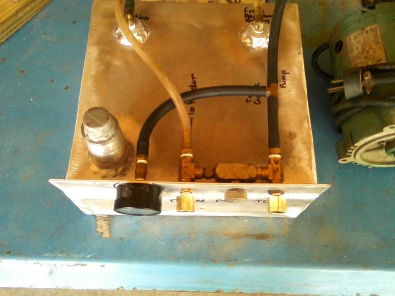 Just started my water cooler a couple days ago. Got the tank done, the front panel(the picture was taken before I added the power switch), and the plumbing mocked up. I ground the welds off the tank because although it's water tight and doesn't leak, the welds weren't up to my standards on looks. The weld I left on the front was 'OK' seeing as I've only been working with aluminum for about a week. I have to get a pump and heat-exchanger, most likely these will come from ebay as I've seen a few of each on there that I think will handle the job. The valve on the front is a needle valve that bleads off pressure if it should be needed. I'm hoping to have a properly sized pump and not need the valve. What PSI are water-cooled torches supposed to be run at? Flow rate? On with the pictures.