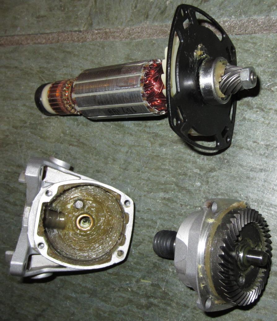 The electric motors between the two different grinders are actually very similar in many respects (same diameter and number of poles, and number of commutator segments) but the Hitachi 6.0 amp motor is significantly longer than the 4.5 amp Drill Master motor. There is no epoxy encapsulation on the motor windings on either.