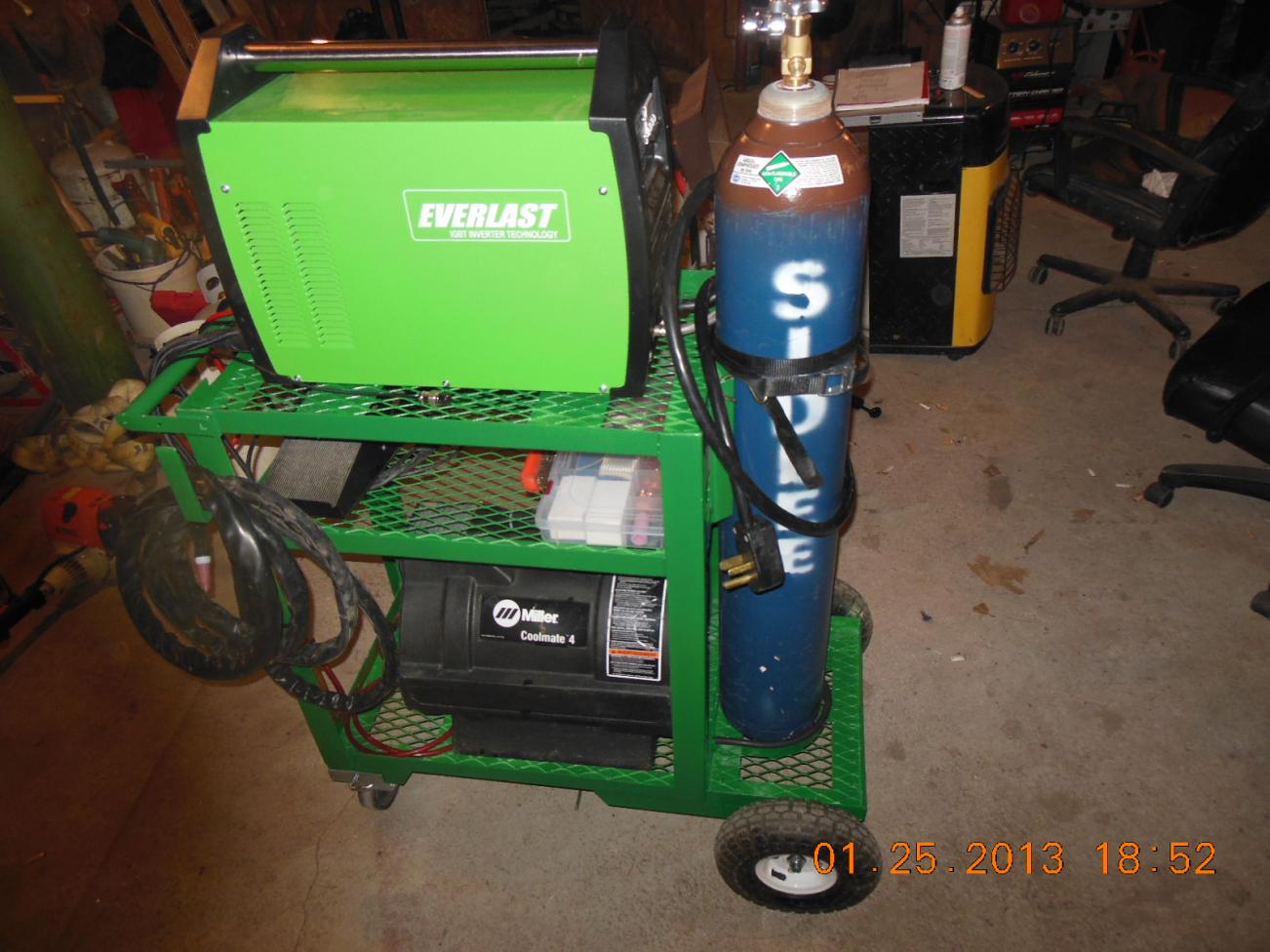 I finally got a chance to spend a little time playing with my 250ex today.Keep in mind that i am a noob when it comes to tig so it's a trial by fire process for me.I had tacked together a cart with a Lincoln that i have and used the tig to weld everything together.Things started out pretty ugly but as time passed i started to get the hang of things.Wish i had taken photos but with time being in such short supply right now i just wonted to keep the torch in my hand,sorry guys no photos at this time.