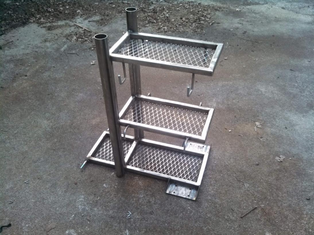 Finishing the project was delayed because I had to go to the steel supplier and pick up a sheet of expanded metal. I used expanded metal for the shelves, as well as the bottom of the TIG filler tubes. I didn't put solid bottoms on the TIG filler tubes because I didn't want them to collect dirt, and I also didn't have any thin scrap, and didn't want to spend a bunch of time and effort cutting out a piece of thicker scrap. The hole saw worked fine on the expanded metal once I clamped it to a piece of wood as a backer-plate. I was really thankful for my PA160-STH when I was welding the expanded metal to the 16-gauge tubing. No way I could have done that with stick!