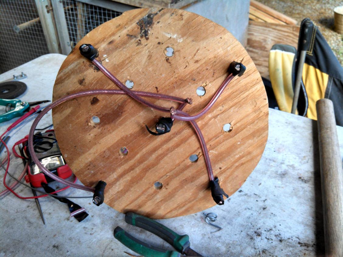 In electrolytic rust removal, the object to be cleaned is the cathode, and you need some sacrificial iron/steel anodes to complete the process. Rebar is a common choice. I decided to use a five gallon bucket as my container, so I used a jigsaw to cut a round piece of plywood as a lid, and then drilled holes and stuck rebar through them. The more anodes you use, the faster the process will go. Also, the process is line-of-sight, so I put an additional anode in the center, to clean the inside of the pipe.