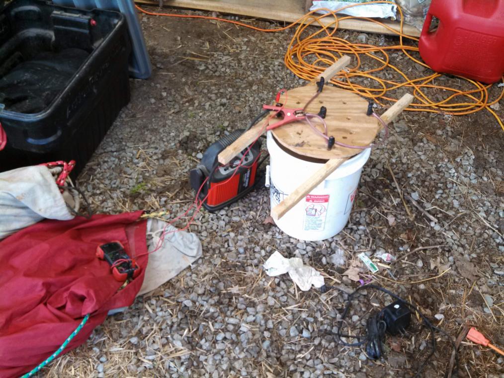 Wiring them up was the single hardest part, because I couldn't find a good piece of wire to use. Finally, I remembered I had some speaker wire in my basement and rigged that up. I still couldn't really properly attach the wire to the rebar. I cut slots in the ends with a zip wheel and then wrapped and taped, but it was pretty shaky. I also drilled holes in the lid because the electrolytic process produces some hydrogen gas, and it needs to be vented. Really, it's probably too small an amount to worry about, but why take chances.