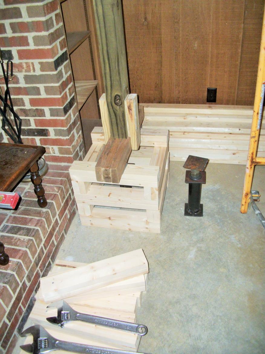 Gettin' closer to putting the screw jacks into service. The platform on top of the scaffolding will be fabricated out of salvaged decking joists.