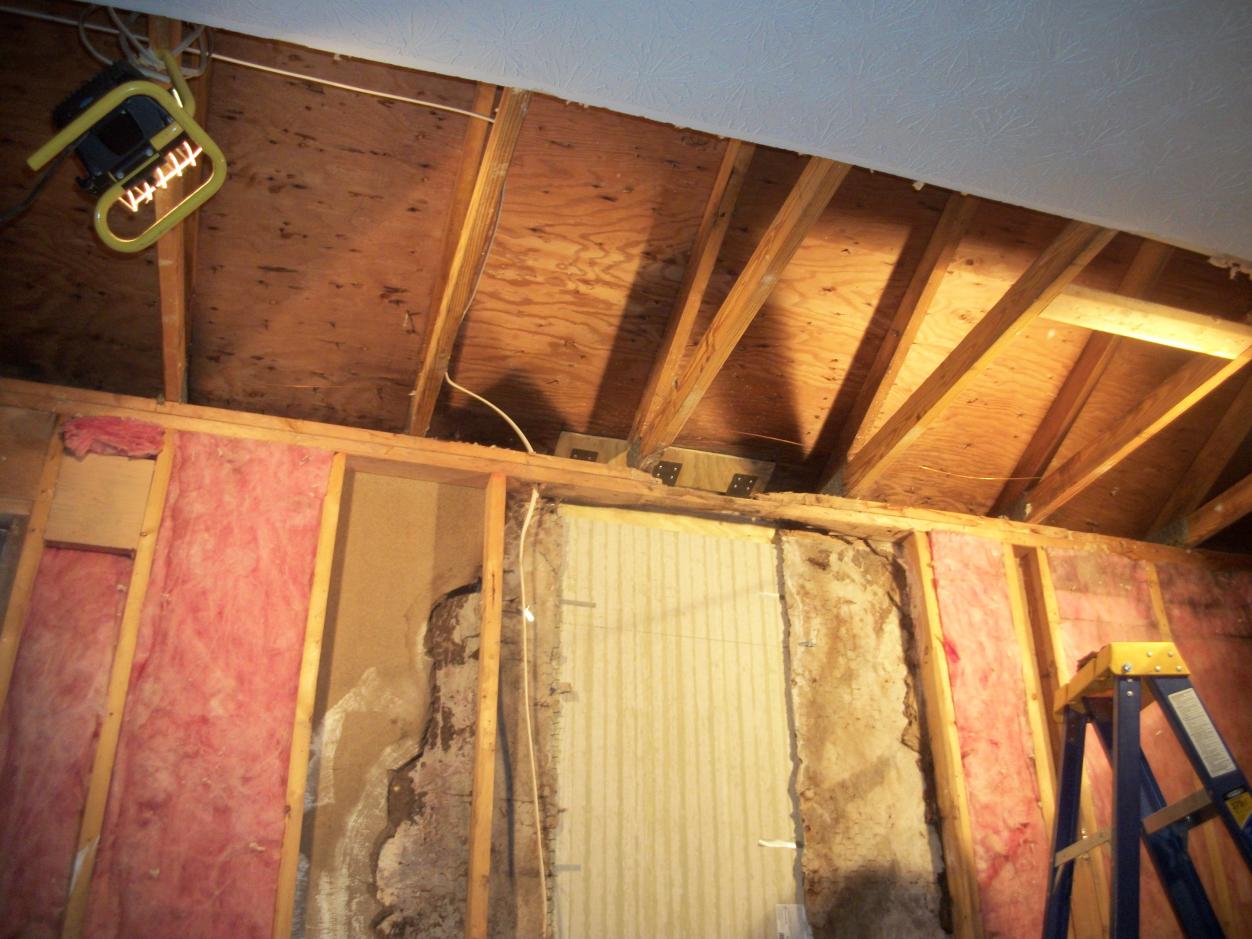 Original window on the right removed. The wall cap plate has been repaired and wall studs installed. The studs on the right are just temporary for the "weather proofing" Visqueen. Once the current storm moves through I'll frame for a new larger window in its near original location.