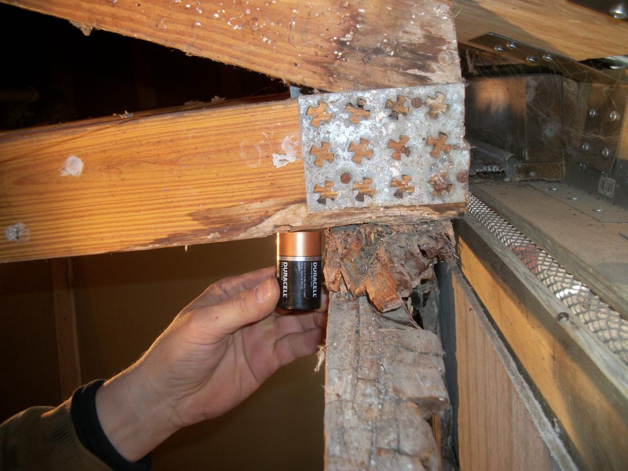 Photo #2. Water damaged truss plus the original builder modification for chimney installation -- a no-no. "D" cell battery for scale.