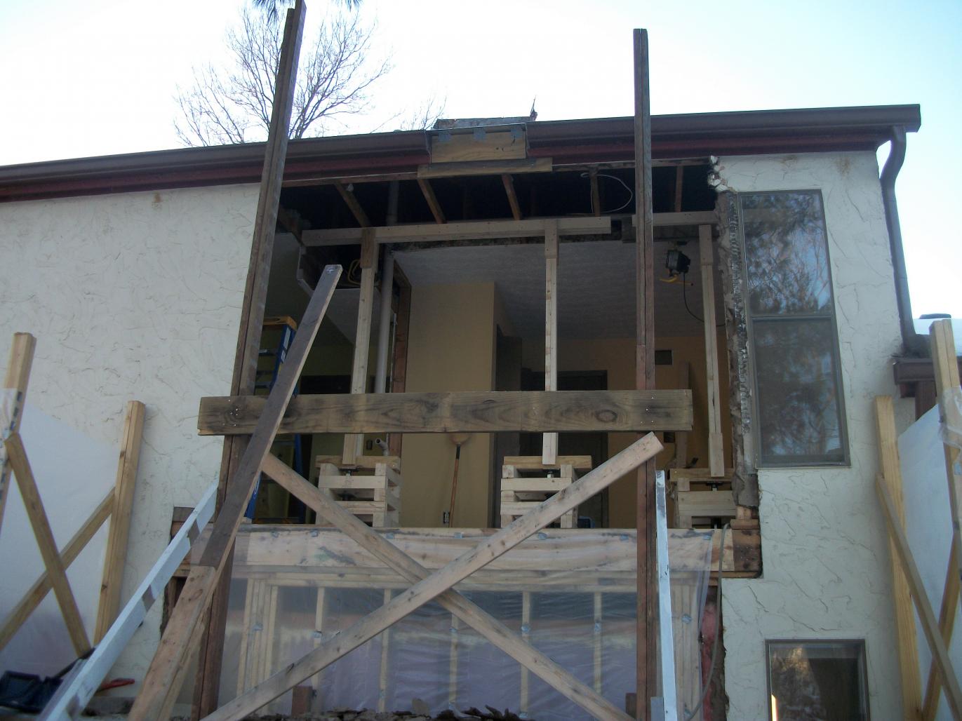 Here's the reason for the screw jacks. This is the second floor above a great room. The chimney has been removed. Once the temporary support is put into place the exterior wall can be breached for the repair effort.