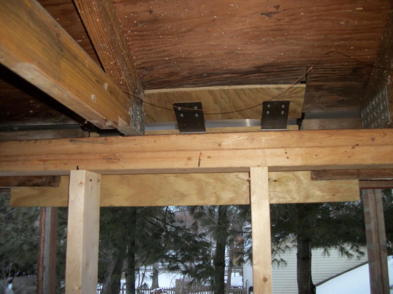 First photo shows the temporary support posts from the first floor great room missing. The second photo shows the right-most remaining floor joist scabbed and anchored into place with hanger.
