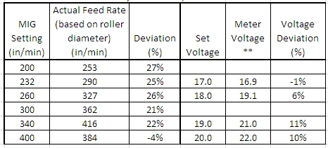 The chart attached shows that the wire feed speed is about 25% faster than the speed as set in Standard mode. The exception is at 400in/min. But I also noticed a lot of rotation speed variation at that speed. Will probably redo that.
