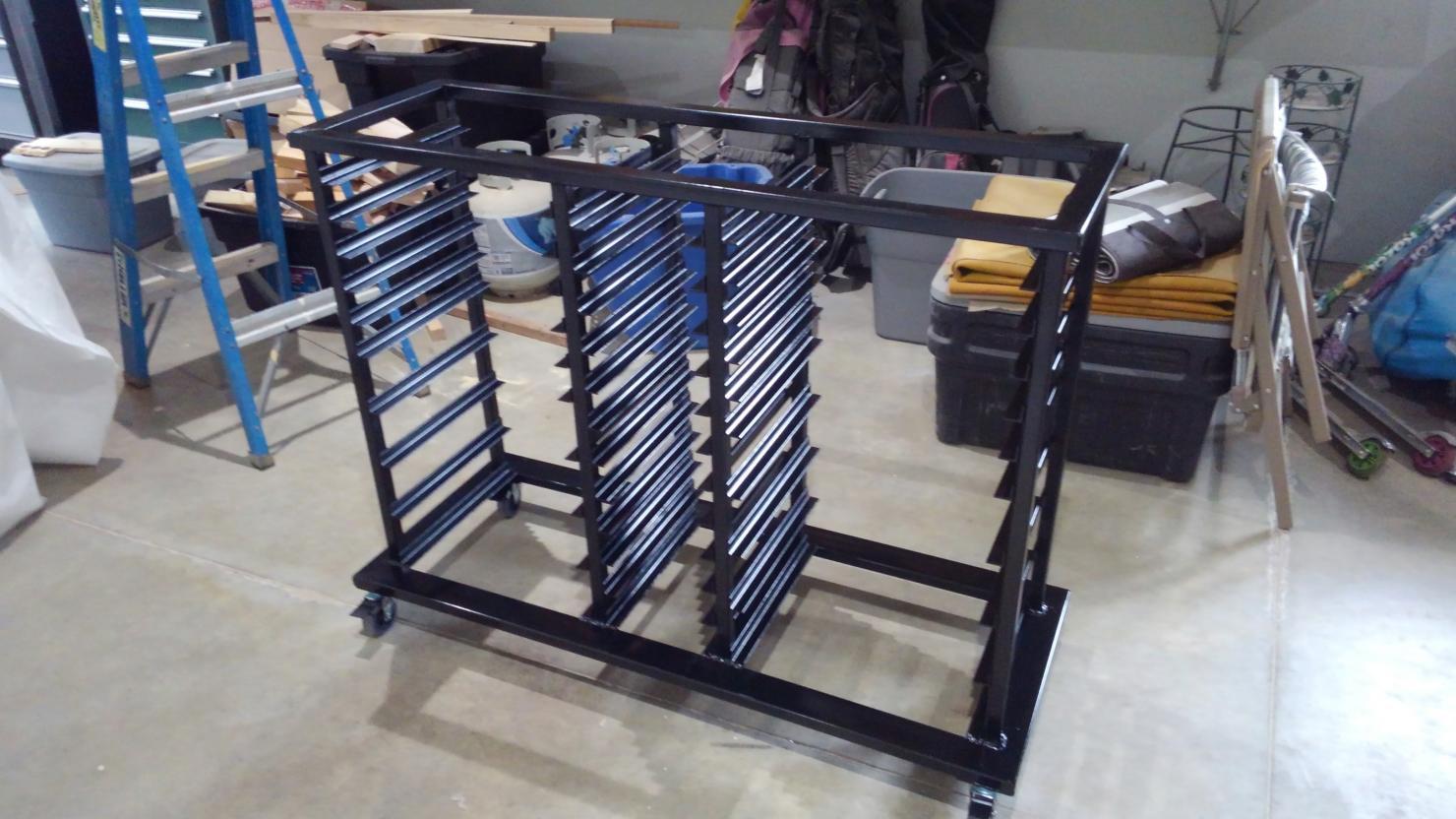 Should be simple enough to exclude the top and bottom and put a bar across the to hang on a track, or anchor to the studs. It does get heavy. everything is 1/8 wall. each "shelf" is 1x1 angle, uprights are 1x1 square. top is 1x1-1/2 rect and bottom is 1x2-1/2 rect. if you're interested in the sketchup drawing, it's all yours. I can't attach the file to this thread, but I can email it to anyone who wants it.