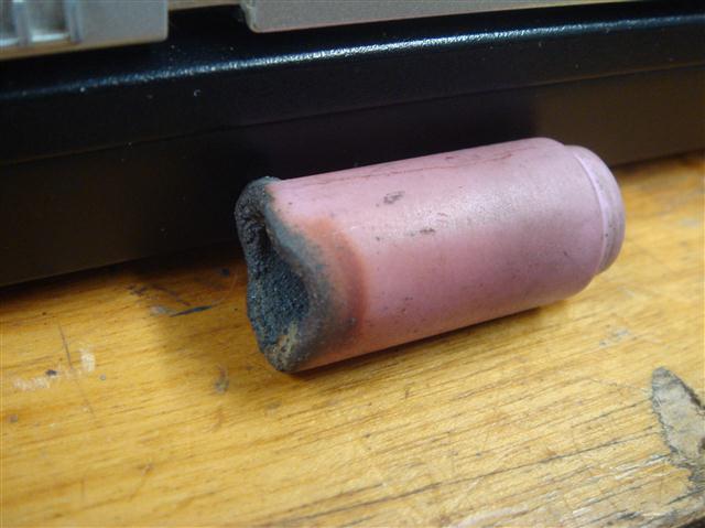 Be aware that although the short hardware does make the torch smaller, it's not much in the 2 series, maybe 1/4" or less. The real difference is when you are using the 3 series, then the short parts are much shorter than the normal. The thing with short parts is that they don't dissipate the heat as well so you have to back down the amps, shorten your welding time, or both. They are great when needed but not the hardware you want to leave on all the time. For example on a 17 torch you can go with about 150 amps, but with short hardware anything over 100 amps starts to overheat things pretty quickly. With water cooled torches this isn't as much of an issue, but with gas cooled, it happens a lot faster. I thought I had a better example, but here you can see how the cup actually starts to melt down from too much heat. If the cup melts, bits of it will fall into your weld puddle and you won't be happy.