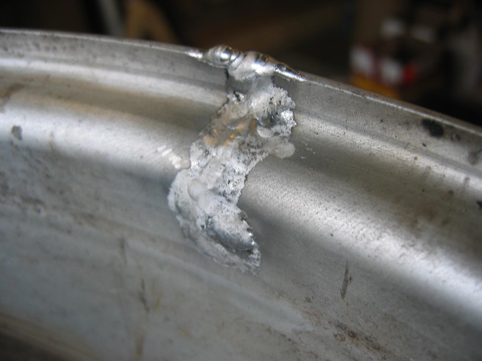 I welded some cracked aluminum automotive wheels for a local wheel restoration company. Here is one that was cracked all the way through.