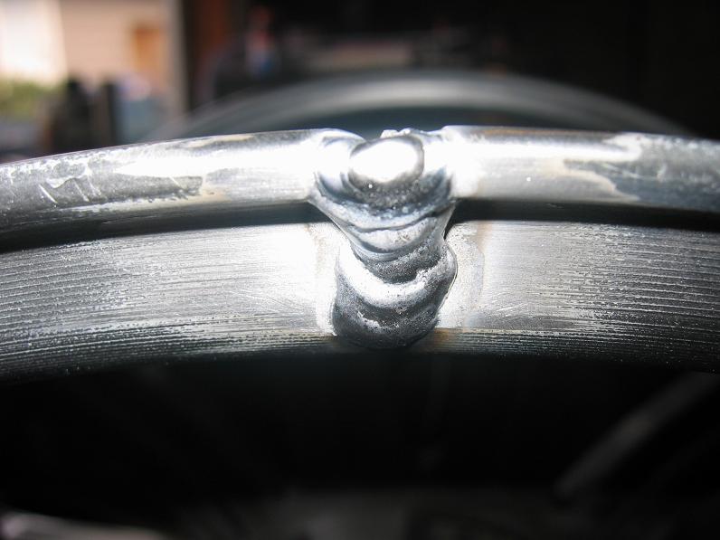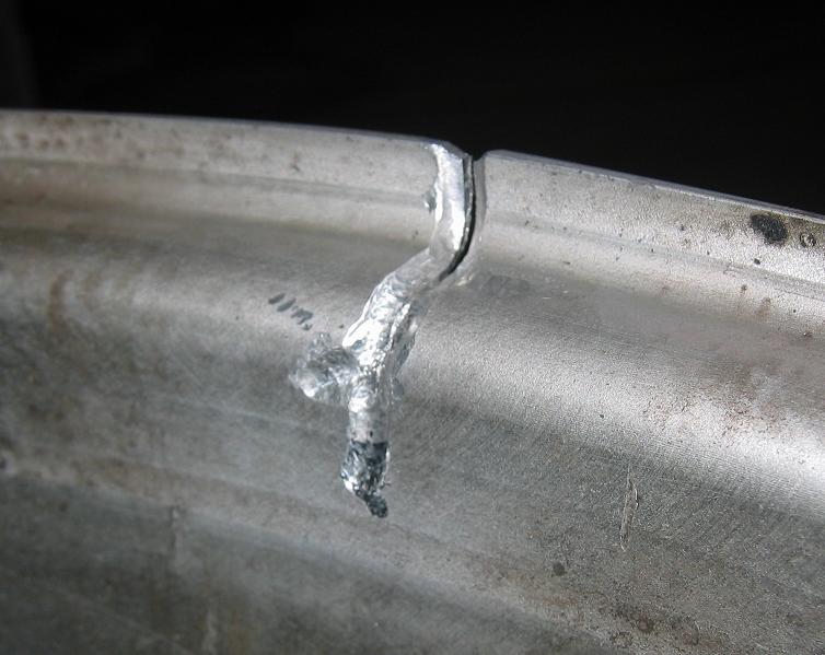 I welded some cracked aluminum automotive wheels for a local wheel restoration company. Here is one that was cracked all the way through.
