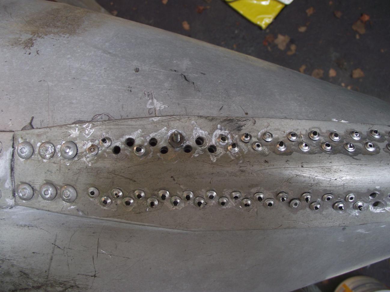 The photo below shows 6 or 8 inches of rivets, maybe 25% done- this project is turning out to be more of a scrape than I’d anticipated, and may start to bump up against the “too much grief for not enough payoff” threshold.