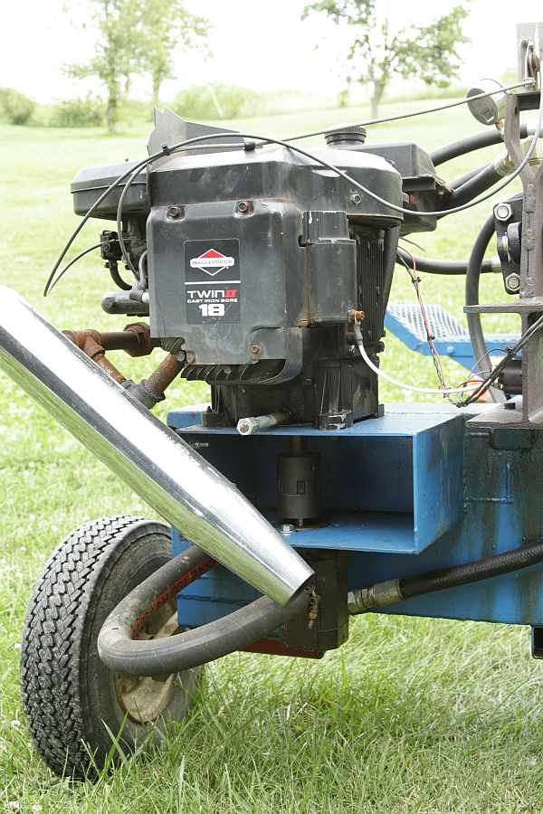 This was originally a Speeco 3 point hitch splitter. I traded a black powder rifle for it. I scavenged an 18hp engine off a junk lawn mower for the power. Found a 28gpm 2 stage pump for a good price on Ebay to mate to the engine. The wheels are mounted to torsion axles donated to the cause by a friend of mine. The tank I had welded up at a local shop to my measurements. Figured out later that I should have made it bigger with better baffles. There's so much turbulence in there that I can't run a vented tank cap. It spews hydraulic fluid out the vents with much gusto. LOL. It only holds 15 gallons, and it should really have 25. To split the pressure difference in the tank, I ran the cylinder about halfway out and loosened the cap to let the pressure equalize, then tightened it back. That way there's not too much vacuum when it's fully extended and not too much pressure when it's retracted. The beam working height is about 32". Comes up on me about mid-thigh. The filter is on the return side and is rated for 35gpm.