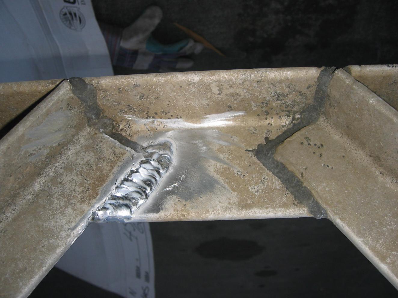 I repaired a cracked section using similar crack repair techniques I perform on aluminum wheels. Grind a vee in the crack on both sides using a carbide burr, mechanically deoxidize and solvant wash, and then weld on both sides for full penetation without very wide of a weld bead or heat affected zone. (But since this crack was caused bya stress riser next to the filler weld, I feathered the filler weld out on the side with the filler, to distribute the stress out over a wider area.)