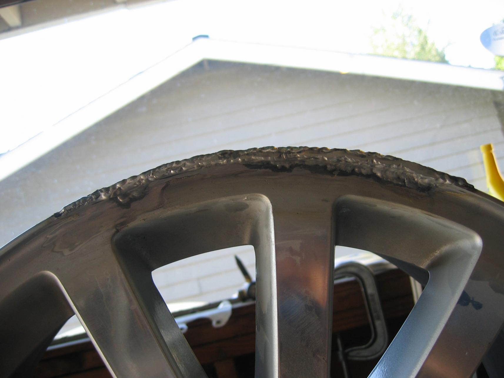 After some grinding (because I got a little filler rod feeding happy on the first pass), I did a second welding pass to further fill in and 'touch up' any low spots. I also noted that the aluminum deposited in the first pass I ground down, was totally solid and free of porosity and inclusions (a good thing!). And after the second weld pass I'll say, it's ready to go back to my wheel repair customer for them to further work over. (They will further grind/smooth, straighten as needed, and paint.)