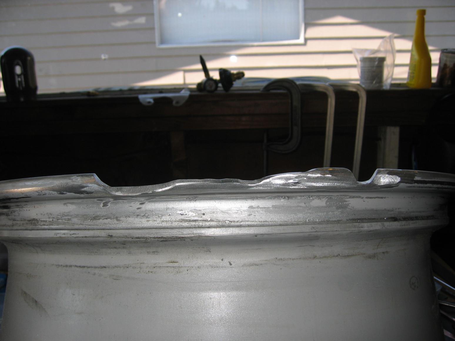 This aluminum wheel will be my first experiment (and also a paid welding job) where I will try the Helium. The outer wheel lip was previously repaired with bondo/body filler, which cracked out when a tire was being mounted, a poor repair solution. I hammered and ground it all out (and I even found an extra "hidden pocket" of the stuff! Tapping with a hammer, the filler sounds dull compared to the sharp metallic ring of aluminum), and prepped it down to fresh aluminum surfaces with a flap wheel.