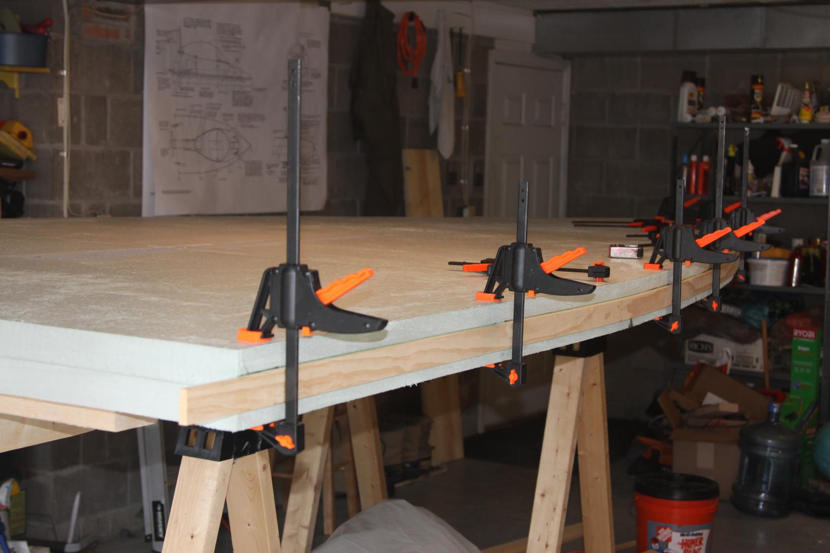 After the top of the hull is done, the bottom of the hull gets a foam "runner" around the edges. It's toped with plywood and will have a wood strip glued on for the inner skirt attachment.