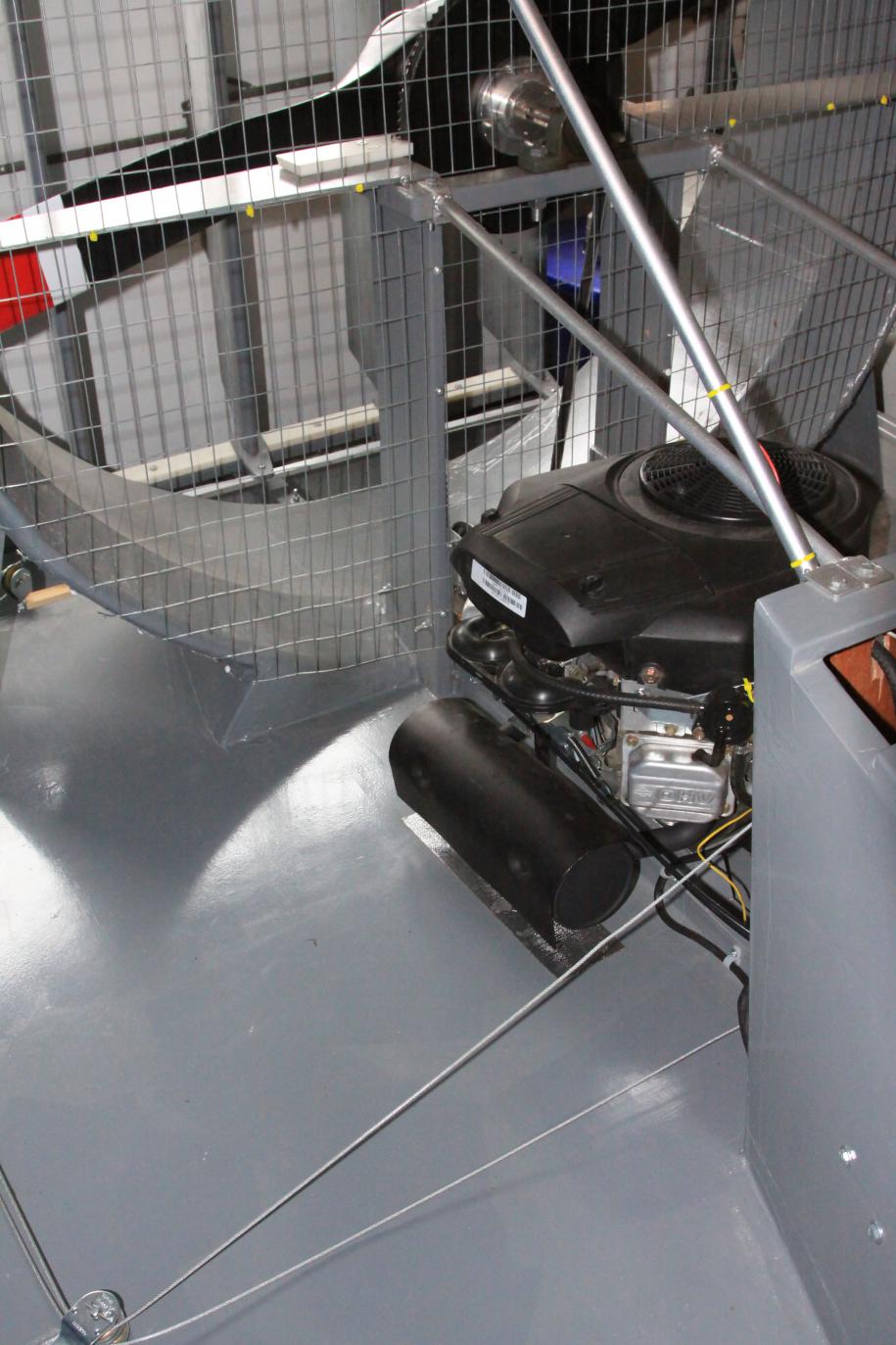 It does have a muffler. Originally, the engine was mounted per the plans with the muffler facing forward. However, my muffler goes lower than the engine mount. Because of that - I had to increase the forward up angle of the engine so the belt didn't hit the muffler. As a result of the up angle, I had issues with the rear/drive belt coming off.