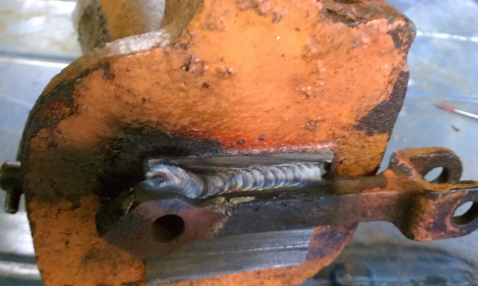 The only differences between these two, at least that matter to me, is the flat bottom one is not a direct bolt in for my HF engine hoist. So I decided to use my HF bandsaw, cut off the old flange and weld it onto the new jack. Keep in mind I was not terribly worried about perfect penetration since this part will remain in compression under a load.