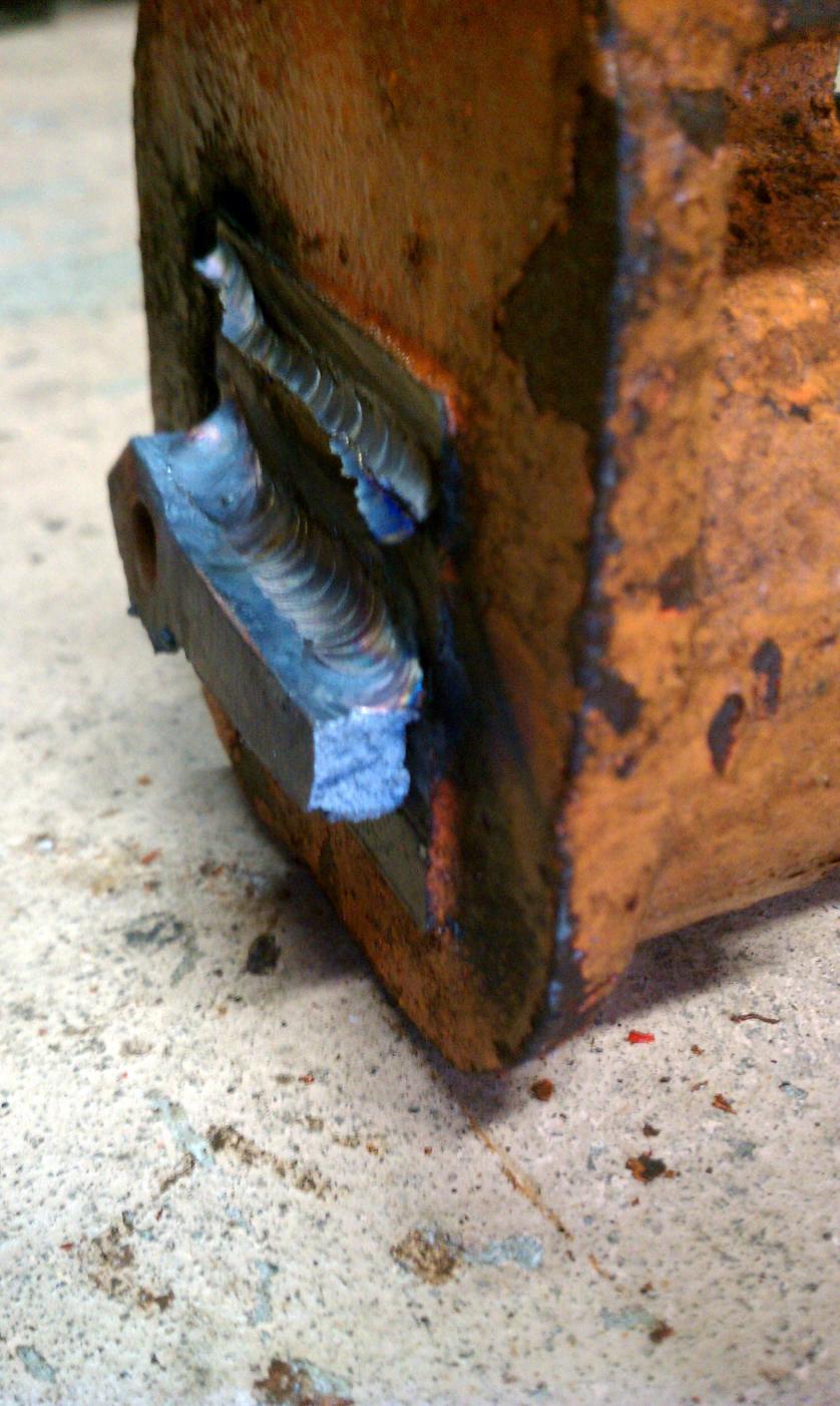 The only differences between these two, at least that matter to me, is the flat bottom one is not a direct bolt in for my HF engine hoist. So I decided to use my HF bandsaw, cut off the old flange and weld it onto the new jack. Keep in mind I was not terribly worried about perfect penetration since this part will remain in compression under a load.