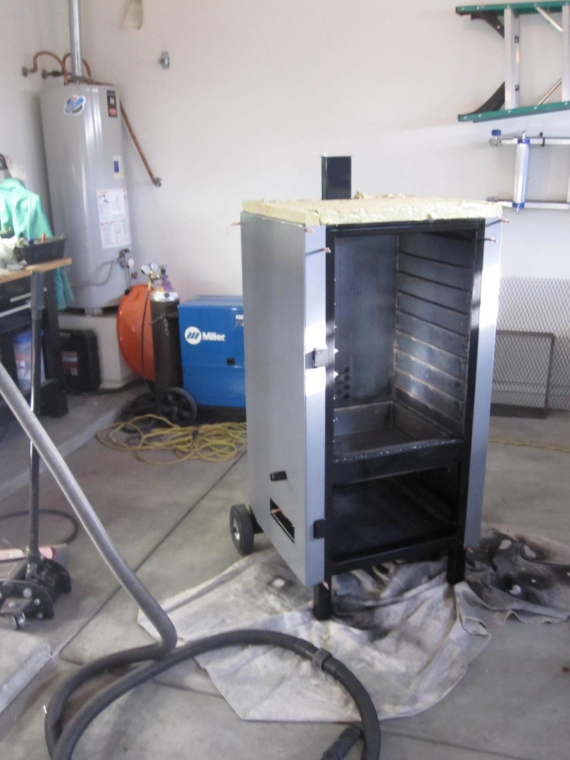 I started an insulated smoker project last year. This thing is a vertical smoker with the fire in the bottom and cooking chamber in the top, it looks like one of the fridges with the freezer in the bottom. The only thing different from the freezer type design is I put the fire in the bottom and the heat raises up inner walls holding the cooking grates and smoke pores over the top of the inner walls to flavor the meat. Smoke drops to the bottom of the cooking chamber and exits up a chimney that starts at the bottom of the cooking chamber. The smoker a 20 inch wide by 20 inch deep by 30 inch tall cooking chamber that will fit up to 8 cooking grates.