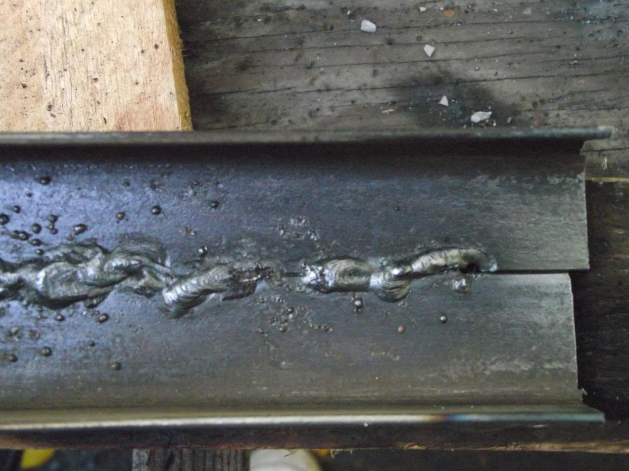 NONE of those ideas worked. I started out at about 75 amps, got no results, and cranked the heat up to about 100 amps thinking it would help start the arc. The drop technique was useless, with or without steel wool. Finally I wound up picking up the striker, starting the arc as in normal welding, and then setting the striker down and holding it still. This actually worked! But the heat was too high and the weld completely burned through (photo 4)- I didn't realize it until the rod had burned to the end of the steel. I flipped the steel around so I could start from the other direction and turned amps down to about 75. This resulted in a tolerable weld, for maybe an inch or so. Photo 5 shows the results of two different successes. I tried to hold the striker still but it waved around- probably why Beth Steel used tape. Photo 6 shows the opposite side of the weld.