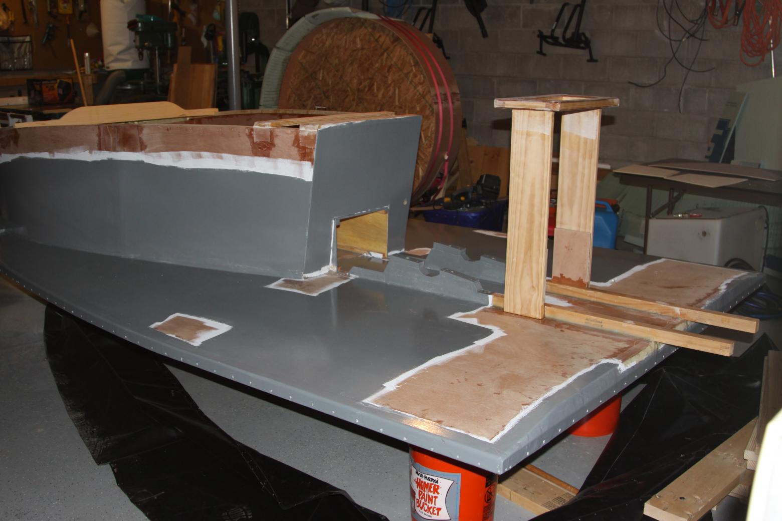 The hovercraft calls for a support at 45 degree angles from the platform that the prop mounts to, to the top of the lift duct. The instructions calls for a number of pieces of aluminum bent to appropriate angles to anchor 1/4" plywood to the platform. The edge on the duct would be fiberglassed as the current horizontal support it.