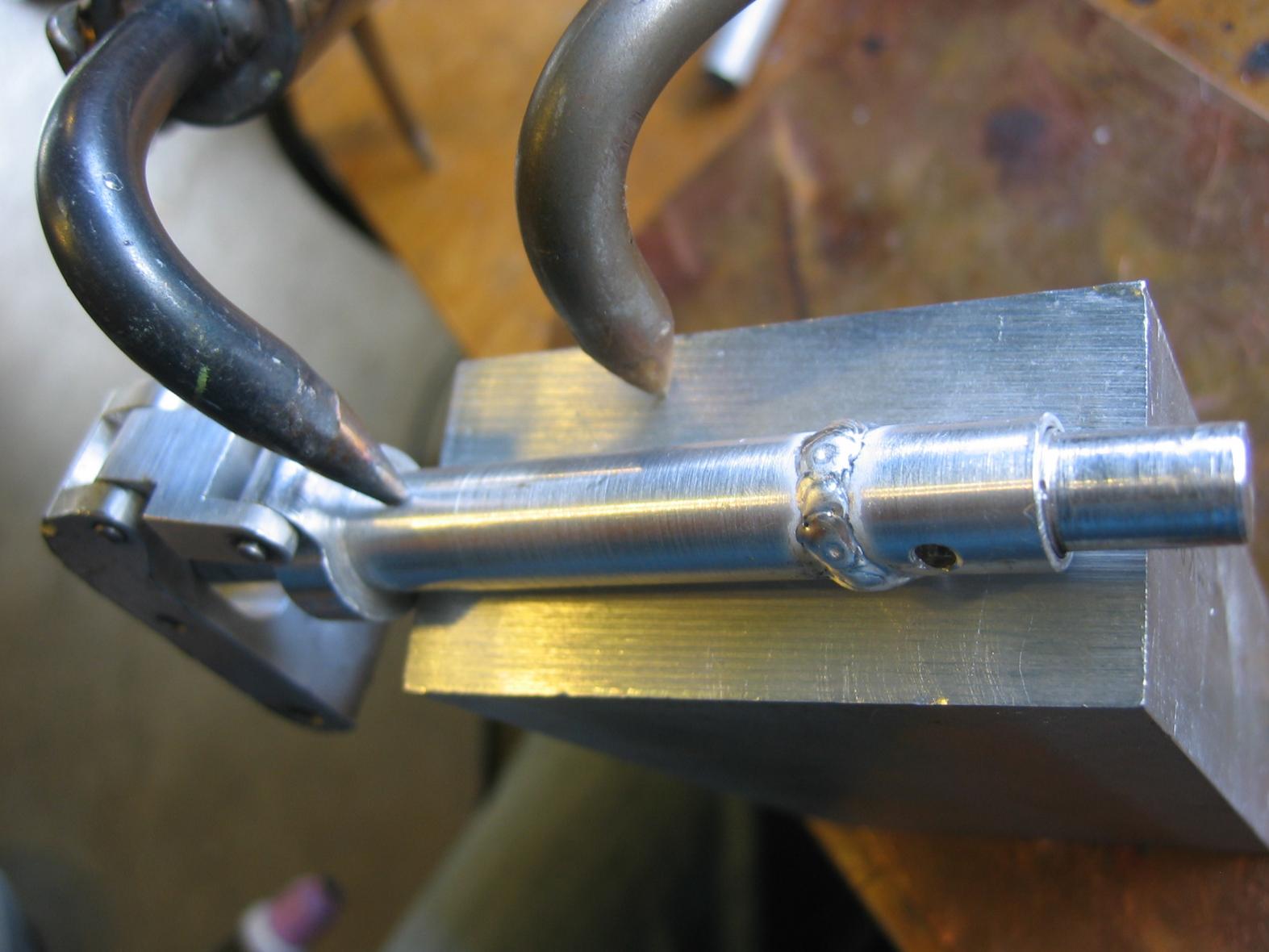 Getting the initial first tack weld (or 2 or 3) can be tricky. In this case, getting the gap not too big was critical, as was getting the right orientation and getting the pieces of tubing perfectly straight. Of course getting evertyhing aligned and straight is an iterative process - what matters is that the final, as-welded part is straight. I recall hammering the parts a bit to persuade them.