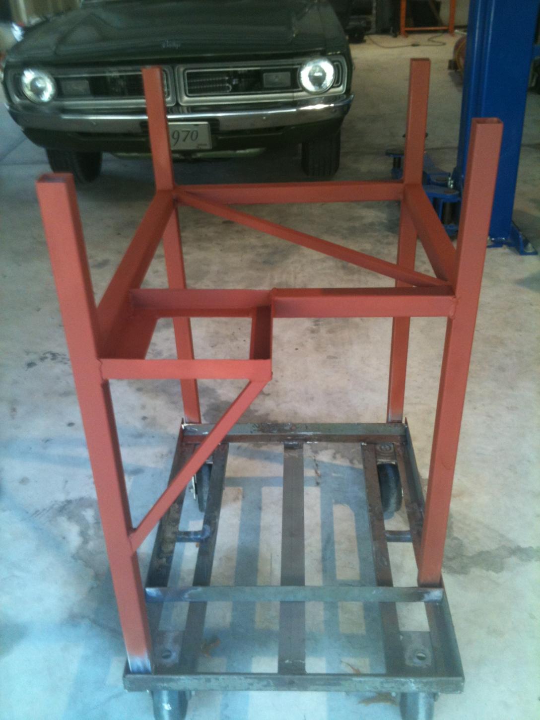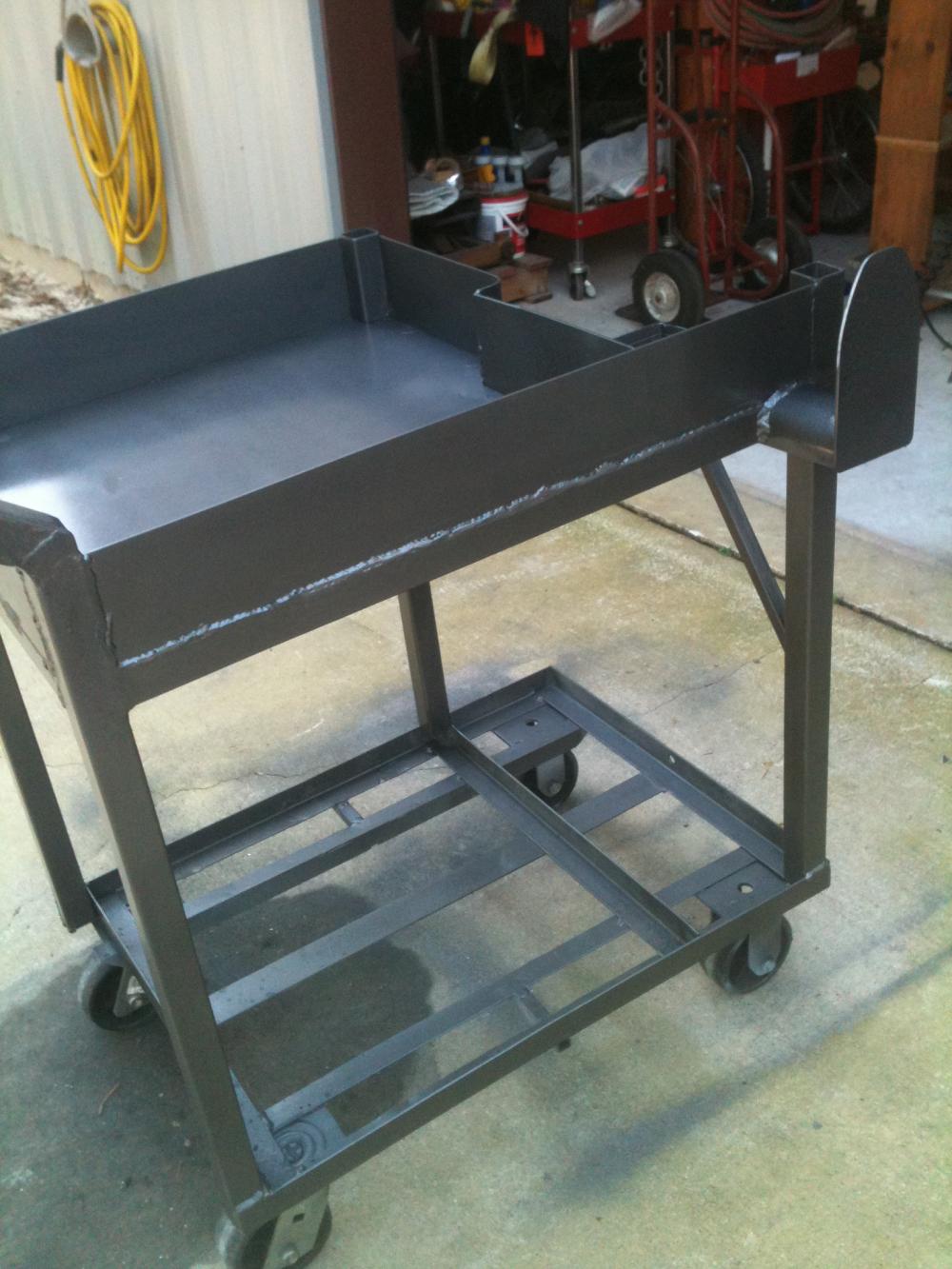 Ok here is project one for me. Ithougt it would be easier to start with a flat dolly that I had what a mistake. No matter how I turned it welder just would not sit right because had two pieces of angle in middle so had to cut off with o/a torch then weld 3/4" square tube braces in middle. Then started to build rack out of 1 1/2'x1/8" square tube for upper shelf and water cooler shelf. So here are some pics will post more as it comes together.