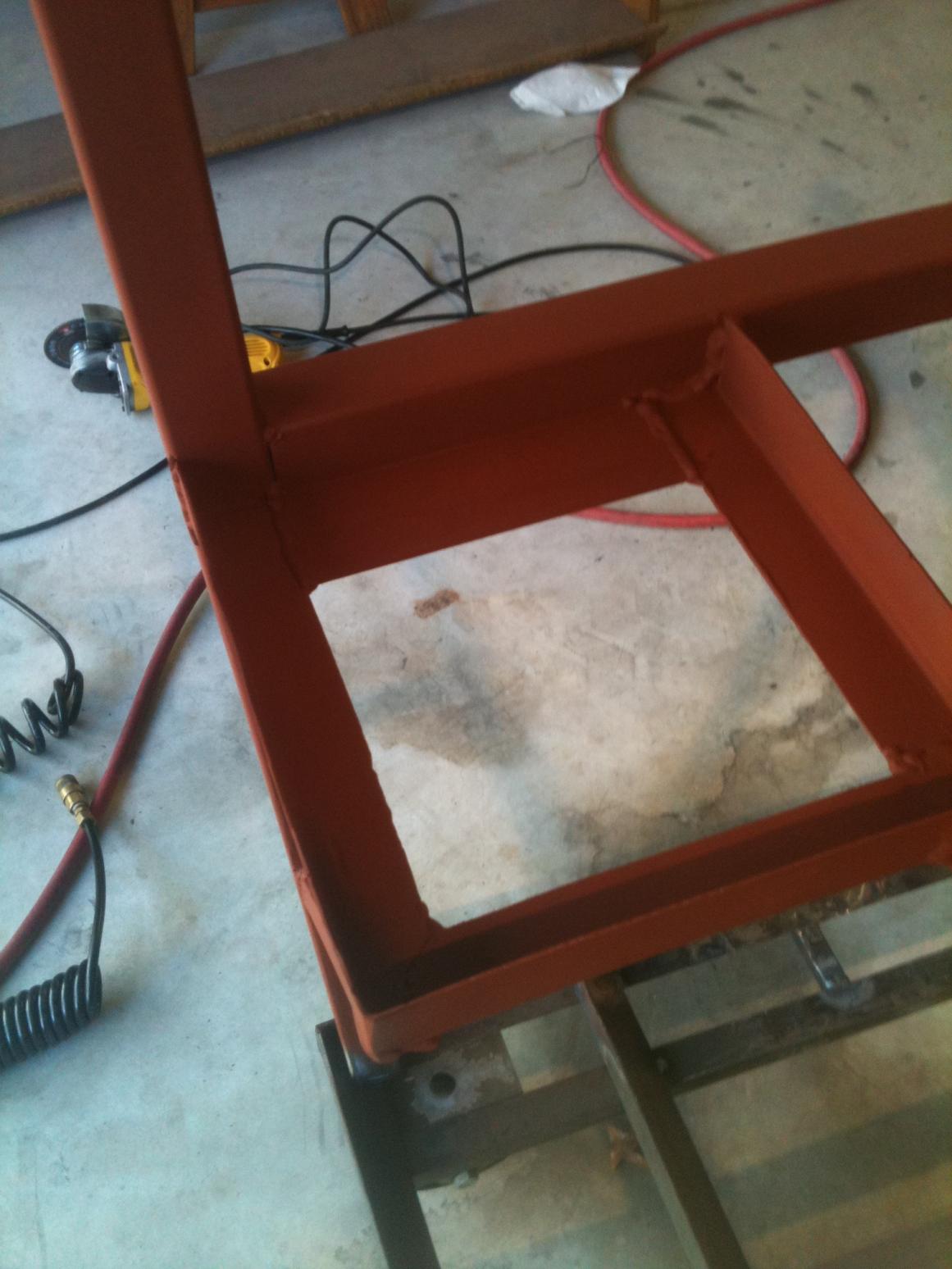 Ok here is project one for me. Ithougt it would be easier to start with a flat dolly that I had what a mistake. No matter how I turned it welder just would not sit right because had two pieces of angle in middle so had to cut off with o/a torch then weld 3/4" square tube braces in middle. Then started to build rack out of 1 1/2'x1/8" square tube for upper shelf and water cooler shelf. So here are some pics will post more as it comes together.