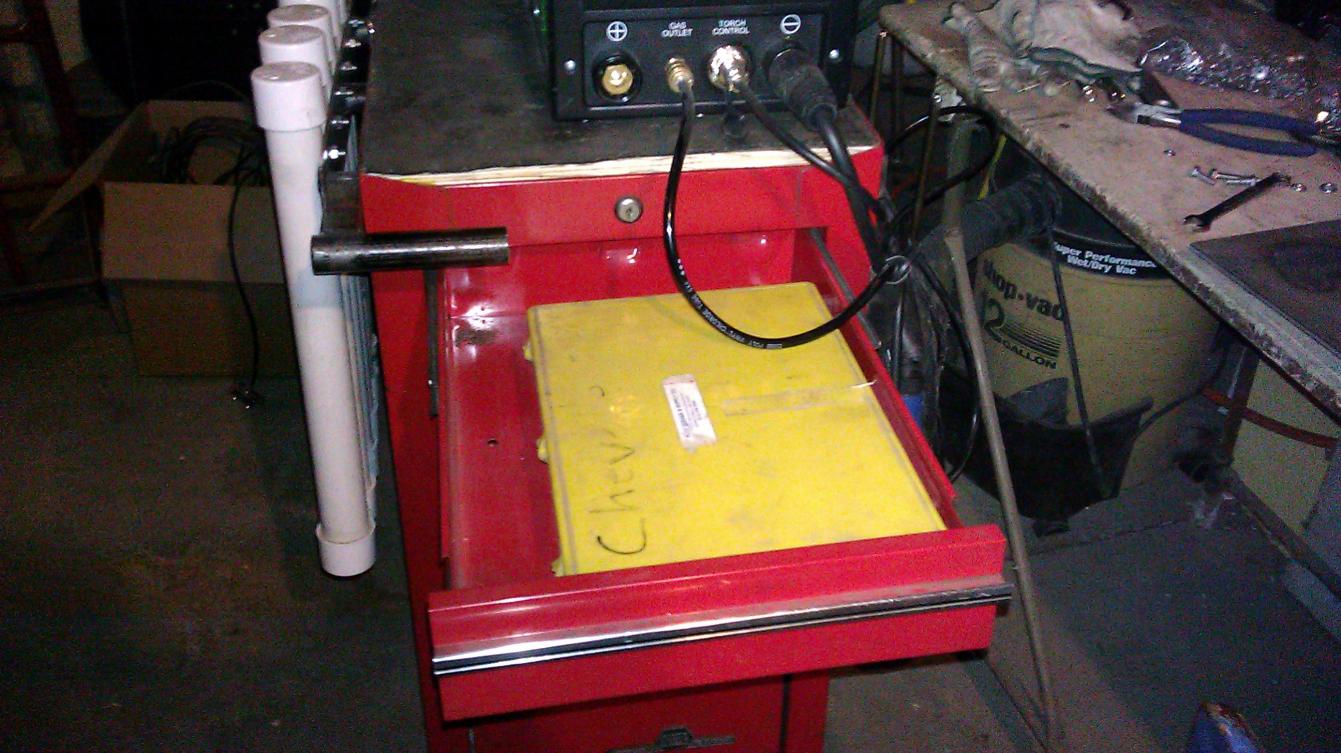 Well I had to put a handle on it cuz there was nothing to grab onto to maneuver it around. As you can see this cart was not very well thought out, I just kinda winged it, every thing I added was an after thought. I still need to put some hooks on the other side to hang hoses and leads.