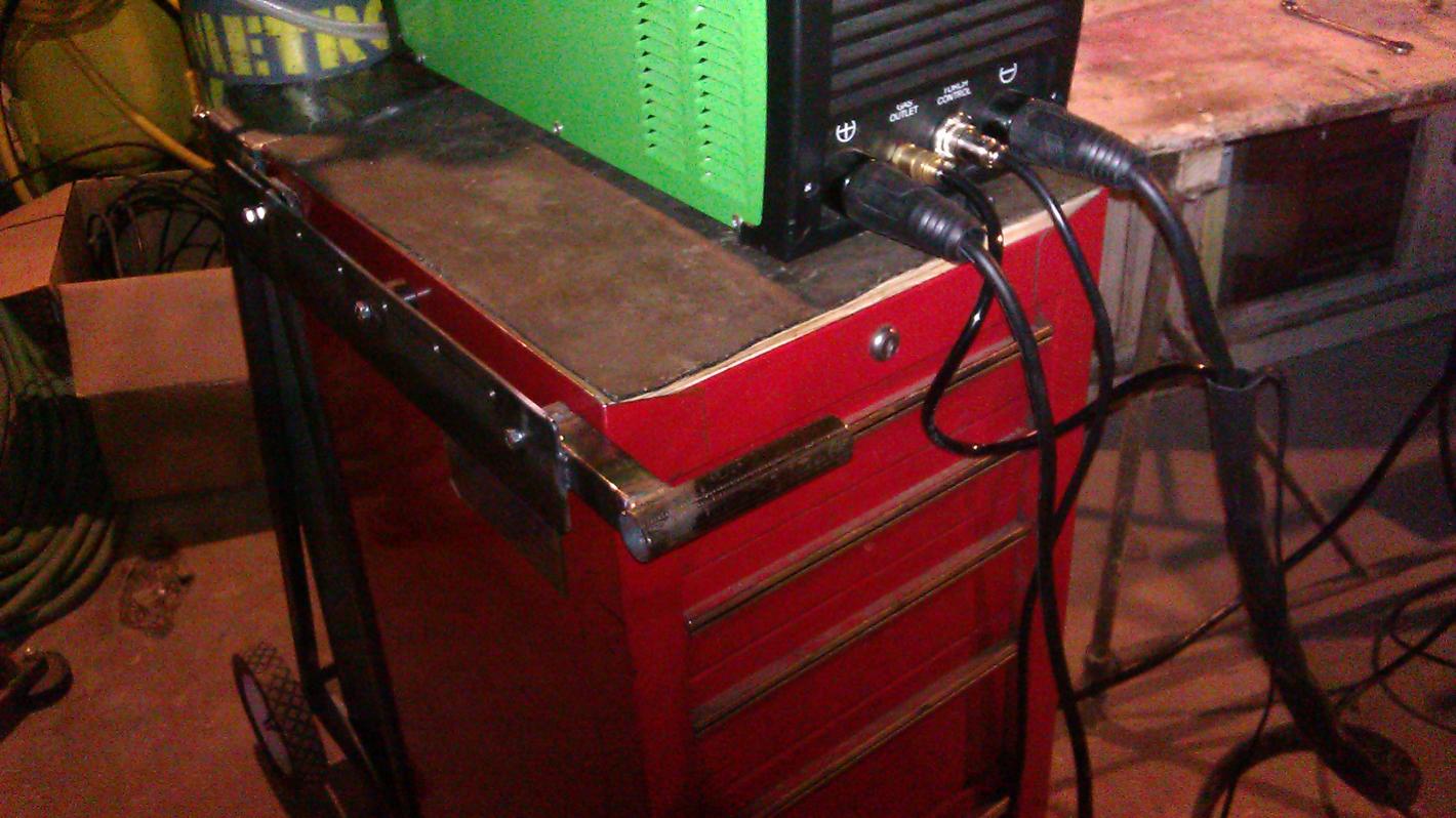 Well I had to put a handle on it cuz there was nothing to grab onto to maneuver it around. As you can see this cart was not very well thought out, I just kinda winged it, every thing I added was an after thought. I still need to put some hooks on the other side to hang hoses and leads.