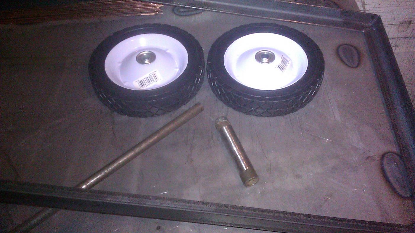 I have a pair of pneumatic wheels but the centers are 5/8 and I picked up 1/2 inch rod, so back to the steel yard tomorrow.
