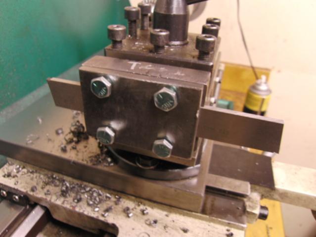 I started with a piece of 3/4'' plate 2x3 inches big. I torched it out of a big piece i had, cleaned it up with the angle grinder, then used the mill to get it squared up. I used a face mill bit to square it up and a 1/4 inch end mill to cut the slot for the parting bit and the slot for the 3" x 1" x 1/4" piece of 4140 flat stock. I tig welded the 2 pieces together with my 400gms at 150 amps and heated it up until it was almost a very dull red and let it air cool to temper any hard spots. I then drilled and tapped the 4 x 1/4-28 holes and cut out the keeper plate.