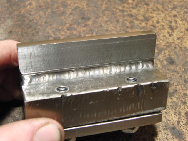 I started with a piece of 3/4'' plate 2x3 inches big. I torched it out of a big piece i had, cleaned it up with the angle grinder, then used the mill to get it squared up. I used a face mill bit to square it up and a 1/4 inch end mill to cut the slot for the parting bit and the slot for the 3" x 1" x 1/4" piece of 4140 flat stock. I tig welded the 2 pieces together with my 400gms at 150 amps and heated it up until it was almost a very dull red and let it air cool to temper any hard spots. I then drilled and tapped the 4 x 1/4-28 holes and cut out the keeper plate.