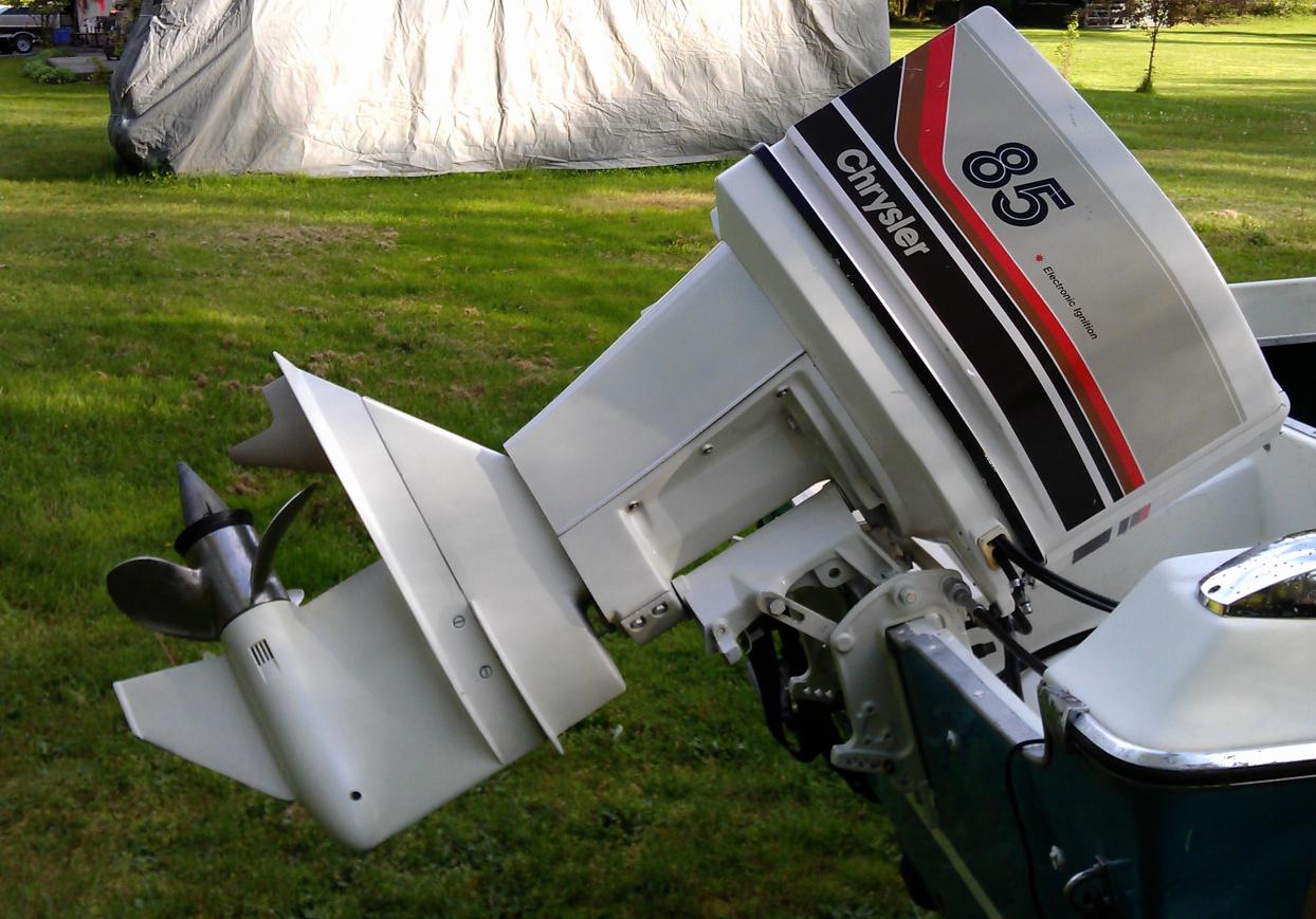 And here is the rebuilt, completely assembled outboard motor (a 1979 Chrysler) that the lower unit got installed into: