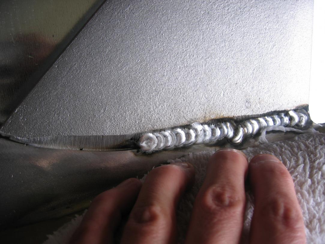 I followed up by putting a couple more tack welds on it, and then I start running a stitch weld bead. I stopped after each stitch, let it cool (cool to the touch and welding "hot and fast" with the helium, I was surprised it didn't heat up that much even right after the first stitch...)