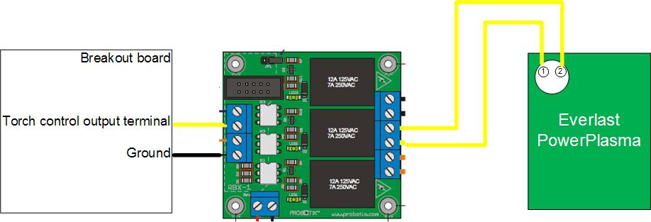 So you should have a wire from your breakout board outputs to the Relay #2 Ctl (+5V) And your CNC plug pins 1 and 2 should be wired to the two terminals that have yellows wires and are marked Other AC or DC Circuit.