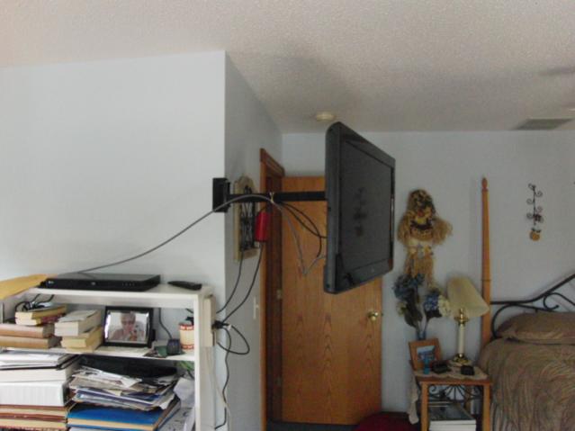 My parents bought a 32 inch LCD tv for their bedroom. They wanted to be able to watch tv while walking on the treadmill or watch it in bed. I fabbed up a wall mound that would mount to an outside corner and swing out in both directions.