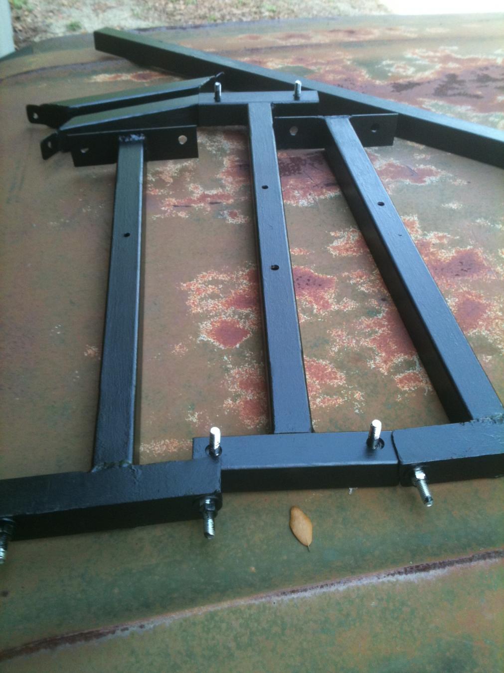 Well here is project 1 for spring contest. I had some scrap 1 1/2 x 1 1/2 X 1/8 square tube, 1 1/2 angle and 2 x 1/8 flat plate. The tube was pretty nasty so I cleaned it as well as I could with a flap wheel but it still tough to tig weld and a little ugly. So heres some pics of a stand I built to hold a Mopar kframe so it will be easier to put suspension and and mount engine and tranny and install by lowering the car on it like they did at factory. I welded it in pieces and bolted together so it could be taken apart and stored. Again I am not a fabricator or a welder so it is crude but hope it will work as planed . It is still a work in progess.![]()