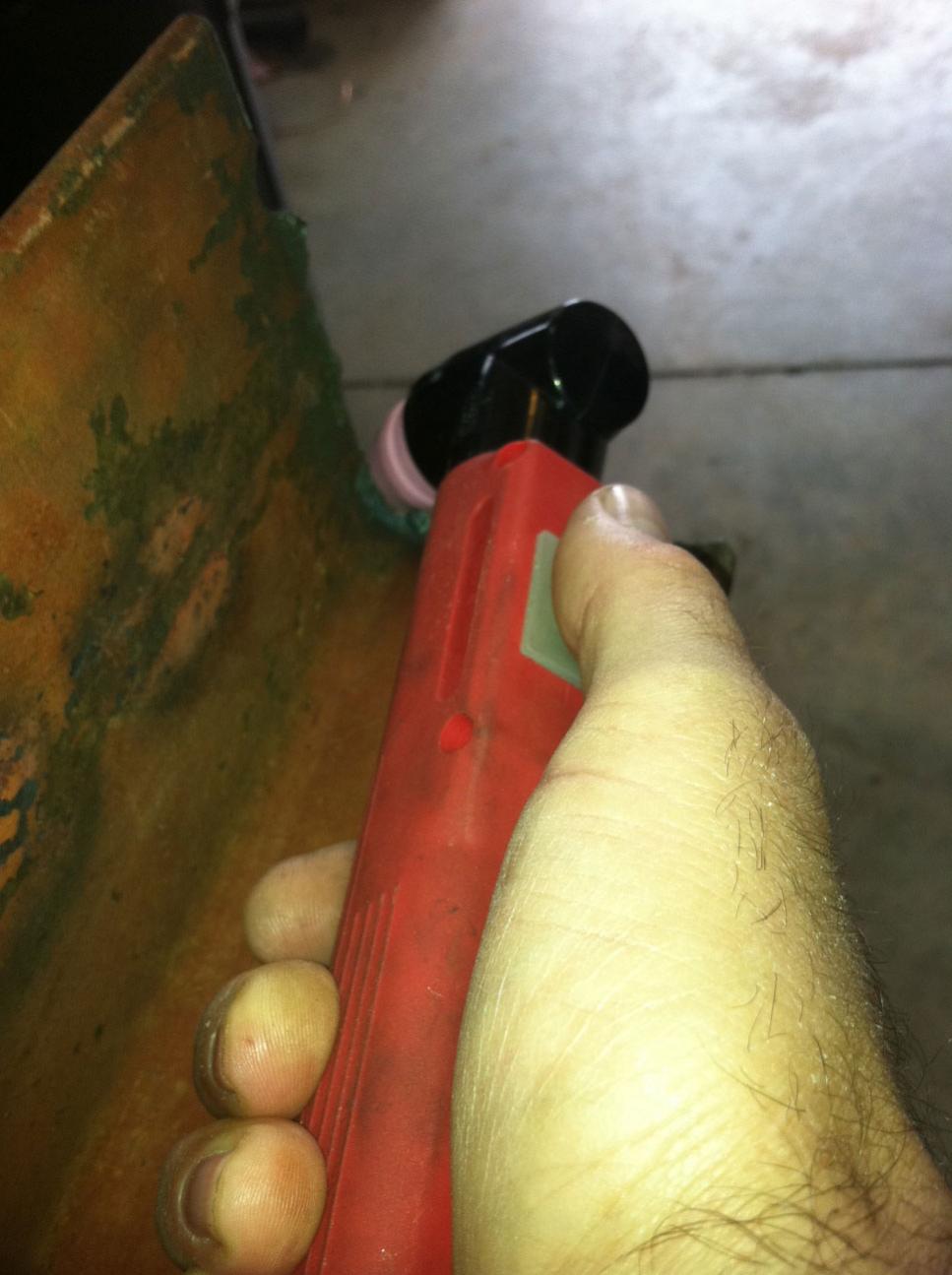 I used a piece of aluminum as a guide to cut the lentil. Amps were at 50 and pressure was approx 60. Cut like butter. I then changed caps for one without the guide and freehand cut at a 45 (just because it was thicker....) It measured .58 - .59 thick. I then used the plasma cutter to mark the holes and then drilled them on the press. All this drag tipping at 50 amps took a tole on the consumables... I then set the 140 at max and tacked the plate on. Once everthing looked good, welded top and bottom.