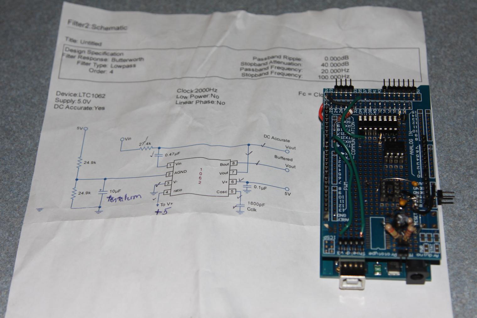 The picture above shows the Arduino Mega with a prototype board mounted on it containing the LTC1062 analog filter circuit and some opto-isolators. It's sitting on top of the schematic for the new filter.