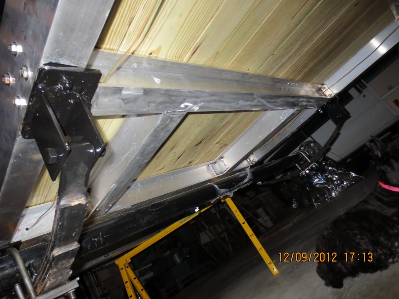 the area at the coupler has had 1/2 in al plate welded in place top and bottom. there are two, half inch threaded rods that go all the way through and are bolted on the bottom. they can't be seen in that side shot because the chains block the view. i don't want a lot of load up front, i even drilled a dozen holes in the i's that the welder sits on for different mount locations, at the moment the welder is in the most forward set of holes. the i's and channel on top are through bolted to the framework below. the box is through bolted as well. i raised them so that i could slide additional items beneath if need be.